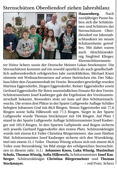 Besonders hervorzuheben seien die Heimwettkämpfe der Schützenmannschaften. Hier kämen laut Schützenmeister regelmäßig viele Fans ins Schützenheim und verfolgen die spannenden Wettkämpfe. Die 1. Luftgewehrmannschaft mit Thomas Stockmayer, Kaderschütze Lukas Stockmayer, Christina Bürgermeister sowie Andreas Meisl liefern sich in der Bezirksliga besonders enge Duelle. Feste Bestandteile im Vereinsjahr seien das Maibaumfest mit den Sauwoidkraxlern sowie die Winterparty mit Perchtenauftritt. Das Maibaumfest wird immer mit der Feuerwehr Oberdiendorf veranstaltet und findet heuer am 24. Mai statt. Im letzten Jahr wurden über 70 Termine wahrgenommen. Darin enthalten waren das Osterschießen, das Maibaumfest, ein Auflage-Cup mit hoher Beteiligung, die Teilnahme am Ferienprogramm, der Huazenberger Dultumzug, das Bürgerschießen, die Feier der Deutschen Vizemeisterschaft von Lukas Stockmayer, der Vereinsausflug zum Attersee, die Vereinsmeisterschaft, die Winterparty, die Adventsfeier mit Königsproklamation und Siegerehrung sowie die jährliche Christbaumversteigerung. Mit der FF und dem TSV-DJK Oberdiendorf habe man eine Brotzeithütte angeschafft, um bei Festen eine Bewirtungsgelegenheit zu haben. Als neues Projekt steht die Installation einer Photovoltaikanlage samt Speicher auf dem Plan. "Damit können wir 75 Prozent unseres Stromverbrauchs abdecken und schonen neben unserem Geldbeutel auch die Umwelt", sagte Schützenmeister Josef Kasbberger. Sportleiter Thomas Stockmayer gab einen Überblick über die zahlreichen sportlichen erfolge der Sternschützen. "Bei der Gaumeisterschaft wurden sage und schreibe 14 erste Plätze erreicht, davon wurden fünf von unserem Kaderschützen Lukas Stockmayer beigesteuert." Besonders erfreulich seien die guten Platzierungen der Schüler in der Sparte Luftgewehr. Maximilian Scholz belegte mit 167,0 Ringen den ersten Platz , die Plätze drei und vier gingen an Sofia Hillewoth und Johannes Graf. In der Rundenwettkampfsaison 2023/2024 stellten die Sternschützen sieben Mannschaften: drei Luftpistolenmannschaften, zwei Teams Luftgewehr Auflage und zwei Luftgewehrmannschaften. Der ersten Luftgewehrmannschaft mit Thomas Stockmayer, Lukas Stockmayer, Christina Bürgermeister und Andreas Meisl gelang erstmalig in der Vereinsgeschichte der Aufsteig von der Gauoberliga in die Bezirksliga. Besonders stolz sind die Sternschützen auf ihren Ausnahmeschützen Lukas Stockmayer. Dieser war Bundesweit im Schießsport aktiv. Er erzielte dabei bei den Wetkämpfen in München Hochbrück und in Berlin hervorragende Platzierungen. Auch bei der Deutschen Meisterschaft war Lukas in Aktion. Höhepunkte waren die Qualifikation für die Nationalmannschaft in Suhl und Hochbrück und das Sichtungsschießen in Frankfurt, bei dem er sich mit dem vierten Platz für den Ausscheidungswettkampf zur EM 2025 qualifizierte. Auch bei der Bezirksmeisterschaft konnten sehr gute Ergebnisse erzielt werden. Außerdem stand auch ein Auflage-Cup auf dem Programm. Die Teilnahme an der Bayerischen Meisterschft in München Hochbrück war ebenfalls erfolgreich. Vier Schüler nahmen an den Jugendfernwettkämpfen teil. Abgerundet wurde das sportliche Programm durch die Teilnahme beim Stadtpokalschießen und der Vereinsmeisterschaft.