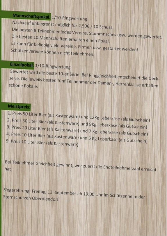 Die Siegerehrung findet am 09.04.2022 ab 19:00 Uhr im Schützenheim der Sternschützen Oberdiendorf statt.