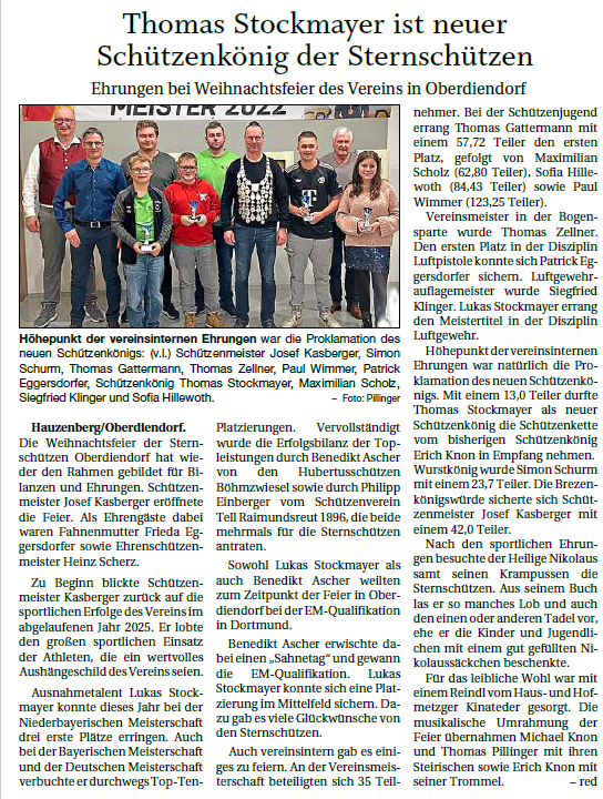Besonders hervorzuheben seien die Heimwettkämpfe der Schützenmannschaften. Hier kämen laut Schützenmeister regelmäßig viele Fans ins Schützenheim und verfolgen die spannenden Wettkämpfe. Die 1. Luftgewehrmannschaft mit Thomas Stockmayer, Kaderschütze Lukas Stockmayer, Christina Bürgermeister sowie Andreas Meisl liefern sich in der Bezirksliga besonders enge Duelle. Feste Bestandteile im Vereinsjahr seien das Maibaumfest mit den Sauwoidkraxlern sowie die Winterparty mit Perchtenauftritt. Das Maibaumfest wird immer mit der Feuerwehr Oberdiendorf veranstaltet und findet heuer am 24. Mai statt. Im letzten Jahr wurden über 70 Termine wahrgenommen. Darin enthalten waren das Osterschießen, das Maibaumfest, ein Auflage-Cup mit hoher Beteiligung, die Teilnahme am Ferienprogramm, der Huazenberger Dultumzug, das Bürgerschießen, die Feier der Deutschen Vizemeisterschaft von Lukas Stockmayer, der Vereinsausflug zum Attersee, die Vereinsmeisterschaft, die Winterparty, die Adventsfeier mit Königsproklamation und Siegerehrung sowie die jährliche Christbaumversteigerung. Mit der FF und dem TSV-DJK Oberdiendorf habe man eine Brotzeithütte angeschafft, um bei Festen eine Bewirtungsgelegenheit zu haben. Als neues Projekt steht die Installation einer Photovoltaikanlage samt Speicher auf dem Plan. "Damit können wir 75 Prozent unseres Stromverbrauchs abdecken und schonen neben unserem Geldbeutel auch die Umwelt", sagte Schützenmeister Josef Kasbberger. Sportleiter Thomas Stockmayer gab einen Überblick über die zahlreichen sportlichen erfolge der Sternschützen. "Bei der Gaumeisterschaft wurden sage und schreibe 14 erste Plätze erreicht, davon wurden fünf von unserem Kaderschützen Lukas Stockmayer beigesteuert." Besonders erfreulich seien die guten Platzierungen der Schüler in der Sparte Luftgewehr. Maximilian Scholz belegte mit 167,0 Ringen den ersten Platz , die Plätze drei und vier gingen an Sofia Hillewoth und Johannes Graf. In der Rundenwettkampfsaison 2023/2024 stellten die Sternschützen sieben Mannschaften: drei Luftpistolenmannschaften, zwei Teams Luftgewehr Auflage und zwei Luftgewehrmannschaften. Der ersten Luftgewehrmannschaft mit Thomas Stockmayer, Lukas Stockmayer, Christina Bürgermeister und Andreas Meisl gelang erstmalig in der Vereinsgeschichte der Aufsteig von der Gauoberliga in die Bezirksliga. Besonders stolz sind die Sternschützen auf ihren Ausnahmeschützen Lukas Stockmayer. Dieser war Bundesweit im Schießsport aktiv. Er erzielte dabei bei den Wetkämpfen in München Hochbrück und in Berlin hervorragende Platzierungen. Auch bei der Deutschen Meisterschaft war Lukas in Aktion. Höhepunkte waren die Qualifikation für die Nationalmannschaft in Suhl und Hochbrück und das Sichtungsschießen in Frankfurt, bei dem er sich mit dem vierten Platz für den Ausscheidungswettkampf zur EM 2025 qualifizierte. Auch bei der Bezirksmeisterschaft konnten sehr gute Ergebnisse erzielt werden. Außerdem stand auch ein Auflage-Cup auf dem Programm. Die Teilnahme an der Bayerischen Meisterschft in München Hochbrück war ebenfalls erfolgreich. Vier Schüler nahmen an den Jugendfernwettkämpfen teil. Abgerundet wurde das sportliche Programm durch die Teilnahme beim Stadtpokalschießen und der Vereinsmeisterschaft.